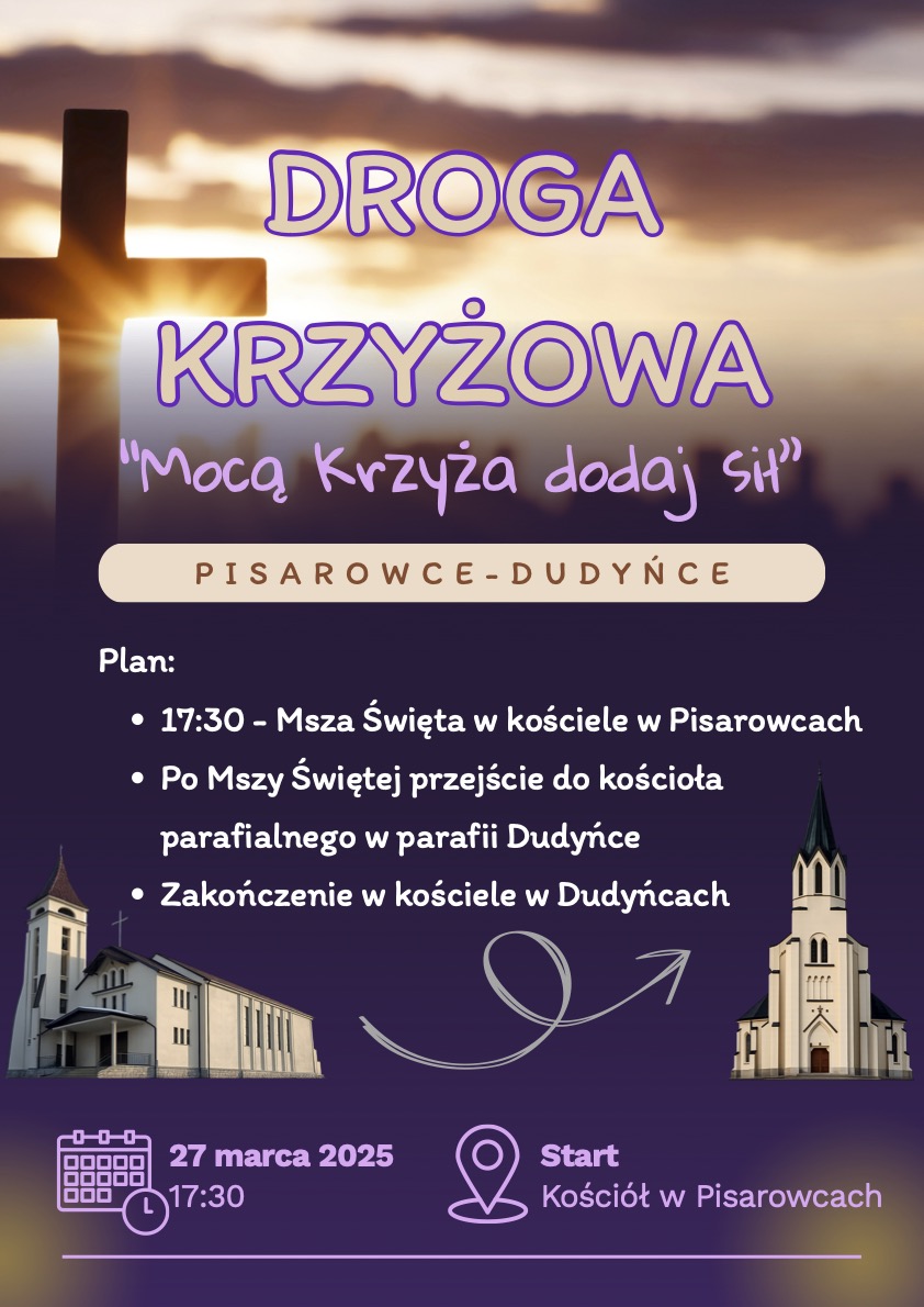 Rozpoczniemy Mszą Świętą o godz. 17:30 w Pisarowcach, a po jej zakończeniu wyruszymy na pieszą Drogę Krzyżową do kościoła parafialnego w Dudyńcach.